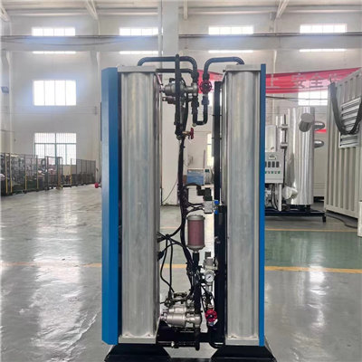 制氧机分离空气主要由两个填满分子筛的吸附塔组成,在常温条件下,将压缩空气经过过滤,除水干燥等净化处理后进入吸附塔,在吸附塔中空气中的氮气等被分子筛所吸附,而使氧气在气相中得到富集,从出口流出贮存在氧气缓冲罐中,而在另一塔已完成吸附的分子筛被迅速降压,解析出已吸附的成分,两塔交替循环,即可得到纯度为≥90%的廉价的氧气。
